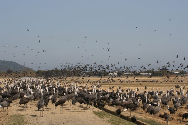 10時40分過ぎ、いきなり奥の方にいたツルが一斉に飛び立つ。その波がどんどん手前の鶴にまで広がってきて断続的にほとんどの鶴が空へ飛び上がる。いったん空にあがった鶴はなかなか降りてこなくて、大きい団体で空を周遊している。その後も12時までの間に2回ほどそんな出来事があった。何のきっかけでそうなるんだろう。お昼になっちゃったので引き上げてきたけれど、その後もなにかあったんだろうか?