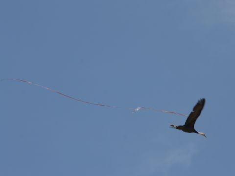 飛び上がったツルたちをぼーっと見ているとこんな鶴が。ビニールひも?自然に取れるといいけど。