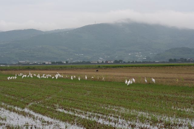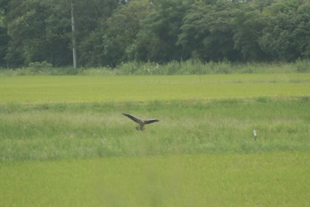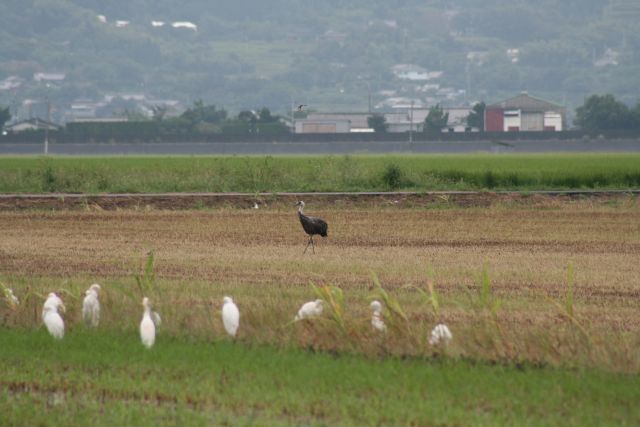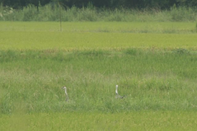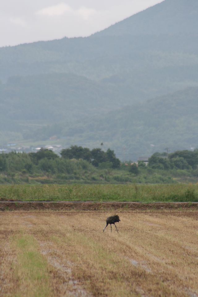 急いでもう1羽がいるであろう田んぼへ移動。残ったナベヅルは東干拓の方をじっと向いたり、地面をつついてみたり。そうこうしている間に9時40分頃、東干拓からナベヅルが帰ってきました。姿が見えるちょっと前から鳴き声が聞こえていたので、位置を知らせあっていたのではないかなあなんて推測。