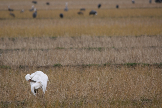ソデグロヅル1羽で羽づくろい。昨日のケンカでちょっと自信が付いたのか、小競り合いでマナヅルに負けてなかった。