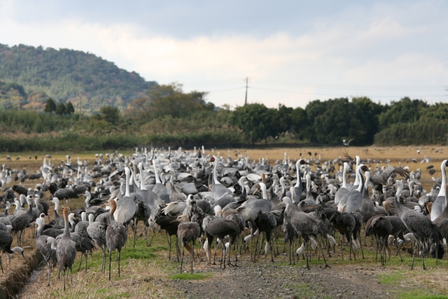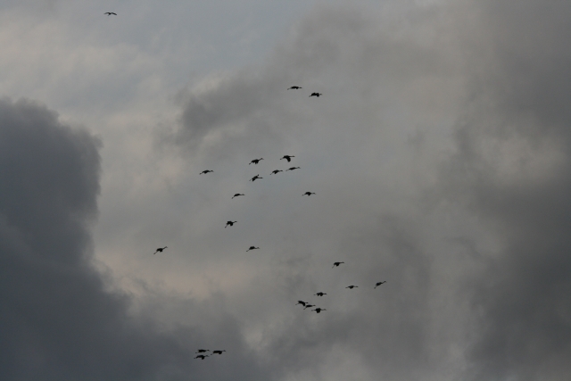 ふと見あげると、高い雲の隙間の上空からマナヅルたくさん降りてきた。もしかしてたった今、出水に着いたツルたちですか?