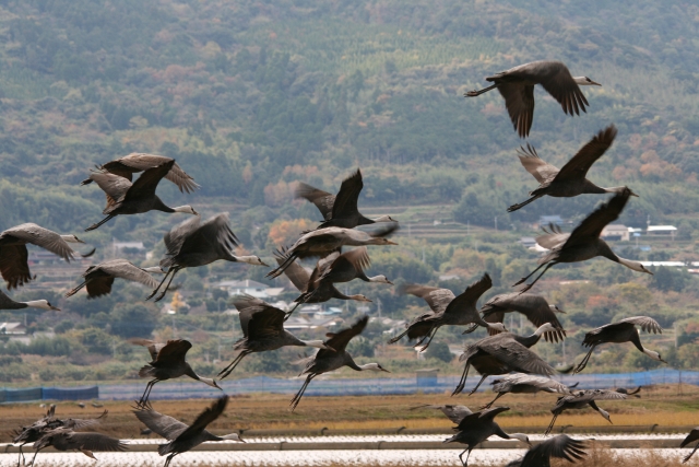 強い風が吹きはじめたら、大勢のツルたちが風に乗って遊ぶ。