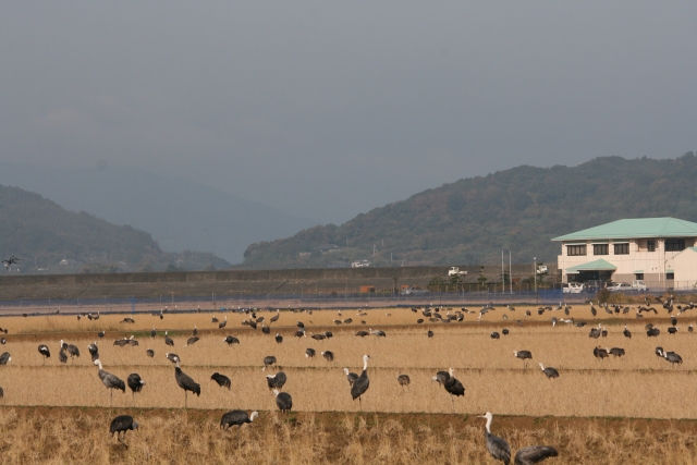 東干拓監視所前。餌ももう少なく、あらかた飛んでしまった後みたい。