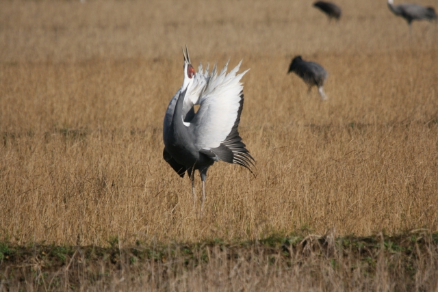 1羽1羽、羽の上がり方が違って、同じツルならいつもだいたい同じ高さでディスプレイするんだそう。あるカメラマンさんは、上まで上がって羽の先っぽがギザギザになっているのが良いんだとおっしゃっていた。こんなツルのことかな?