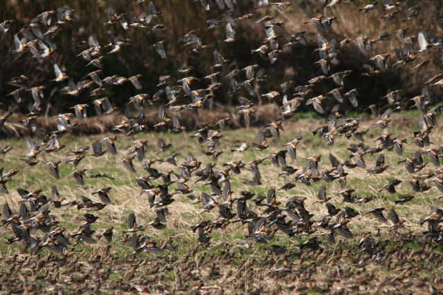 そのうちに田んぼの端から端までちょっとずつ移動しながら飛んでいたら、小型の猛禽類からおそわれていたみたいだった。その後は、電線にとまってすごしていたみたい。しかしすごい数!