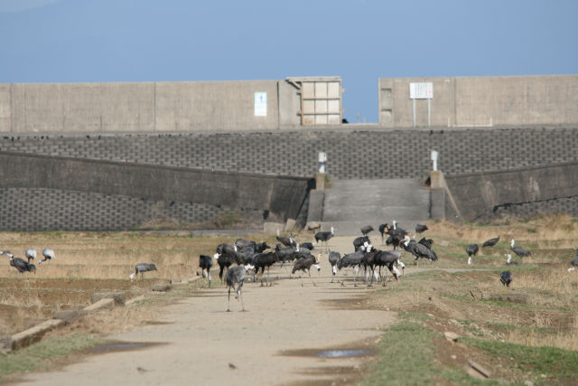 もうすでに給餌された小麦は食べてしまっていて、このくらいしかいない東干拓監視所前。食欲旺盛。ツルの数はもう万羽。