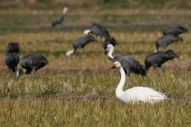 コハクチョウ、今日は東干拓のナベヅルの群れの近くにいました。かわいい~