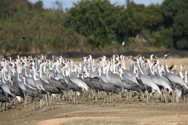 赤いトレーナー服を着ていた子どもを肩車して見ていらした方がいたので、それに警戒したのだと思う。ツルは赤い色をすごく警戒します。できれば、それ以外の色の上着を着て見ることをおすすめします。(赤い傘とかも反応してしまいます)警戒して飛んだ後は、それまでいた場所よりも奥にいってしまって、ツルが遠くにしかいなくて小さくしか見えなくなるのでおもしろみも半減してしまいます。せっかく見るなら近くで見たいものね。