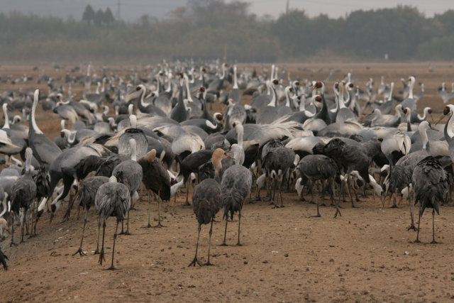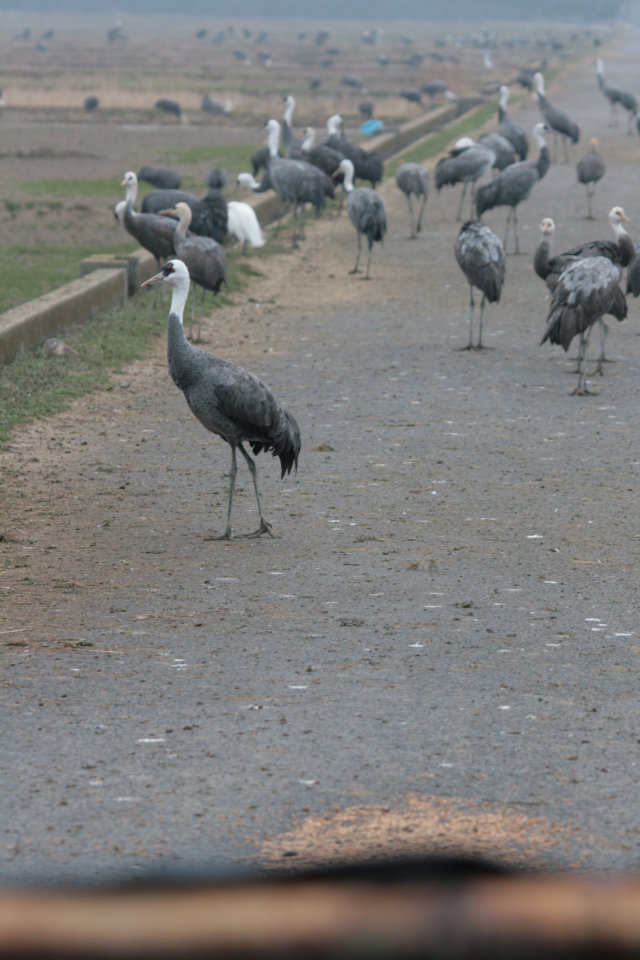 観察センター前は、相変わらずのツルの賑わい。