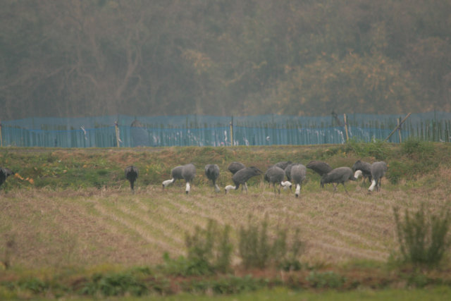 目かくし網の近くで、人が近寄ってきそうでなかなか餌につかない。ちら見を繰り返すナベヅル。