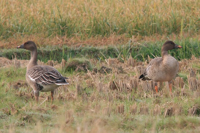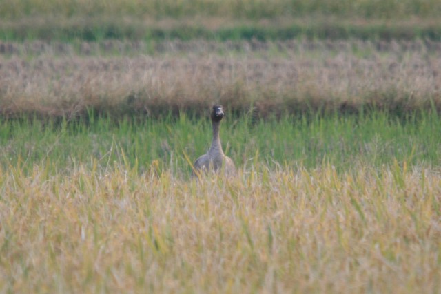 午前中いつもの東干拓の田んぼに見つけられなかったヒシクイが、夕方戻ってきていました。頭をひょっこり出してるのを見つけましたよ。