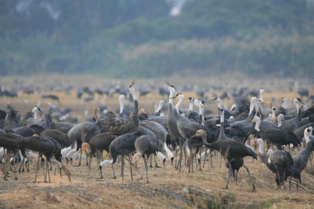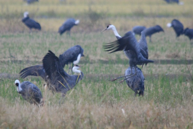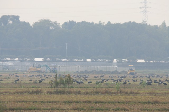 保護区外の工事中の田んぼは、今日は工事もお休みで人気がないからかここにたくさんのナベヅルたちが集まってました。不思議。