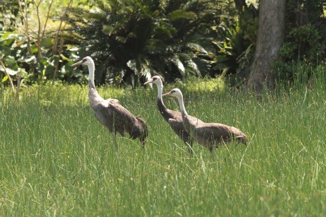 荒崎で、ナベヅル成鳥2羽+幼鳥1羽がひっついて採餌中。