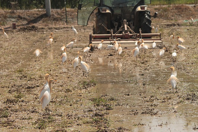 アマサギがたくさん、コサギ・チュウサギも混じってトラクターの後を追いかけてました。