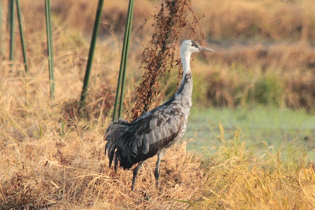 朝一、畦の高い所を移動中の居残りナベヅル1羽