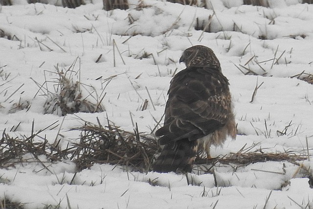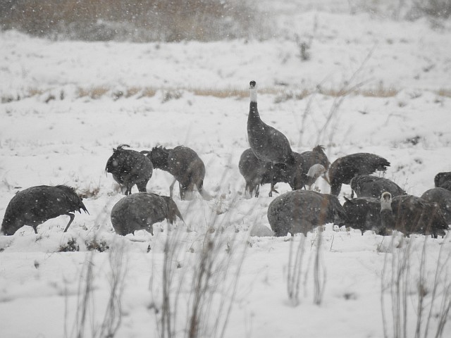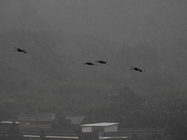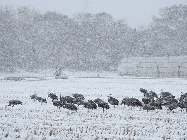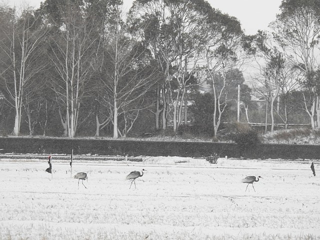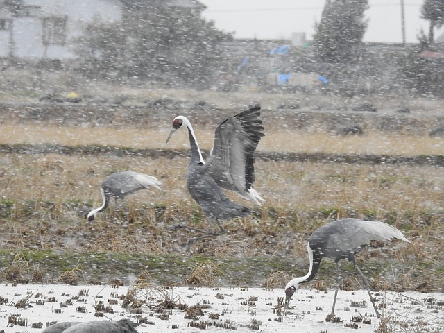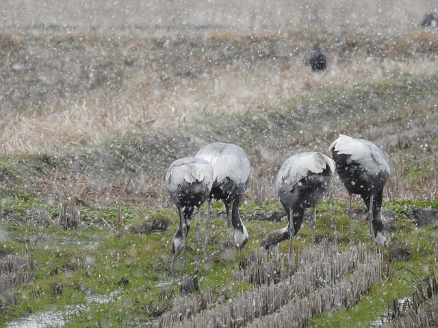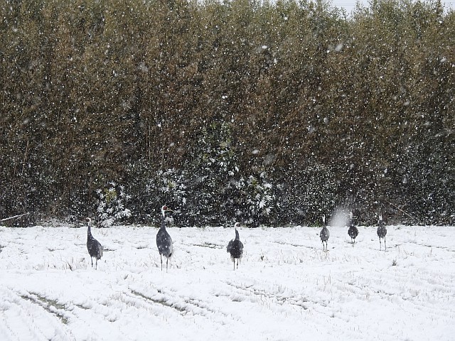 群れのナベヅルは、雪にあまり関係なく必死に採餌