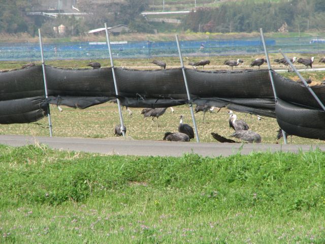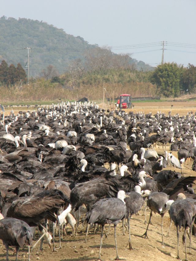 トラクター?にも慣れたのか、人が車内にいて安心しているのか、ある程度近寄っても何ともない様子。車の進行方向にいるときなんかは、ばあっと飛んで逃げてるみたいだけど。鶴って結構図太いな。