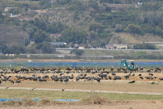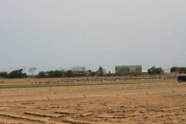 投稿日: 2008年3月22日いろんな場所 11時頃、荒崎周辺を見て回りました。 北帰行が終わったあとの観察センター前。随分寂しくなっちゃった。工事が本格的に始まっていて、ツルたちは左端右端にぱきっと別れています。駐車場の周りの田んぼにも、たくさんの鶴があちこちで割に大人数のグループを作っていました。 近くに鶴が見えないのってちょっと悲しい。
