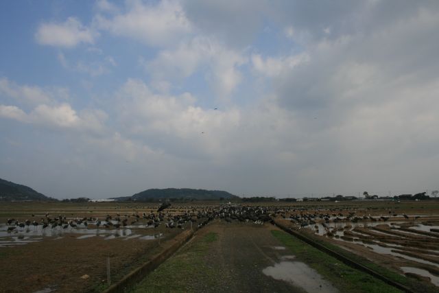 人が歩いているのか?時折集団でツルたちが一斉に飛び立つ。駐車場周辺にも、いくつかの固まりができている。