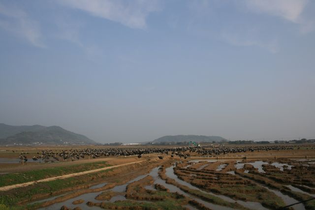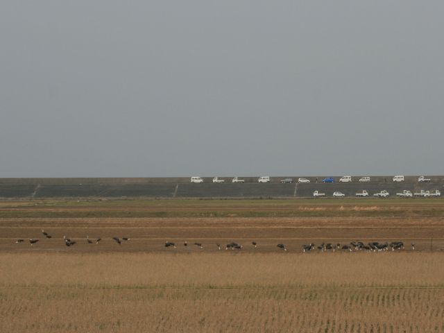 東干拓地ではツルがすごい密集していた。マナヅル一羽も発見。帰ってきたか?車内からの写真で、ツルがちっちゃくて汚くてすいません。