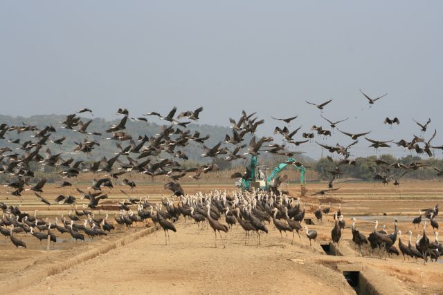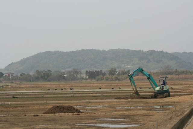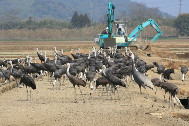 観察センター前にはこれだけのツルしかいなかった。手前の土砂の山が午前中には二つあったのが一つに減っているし、かなり前の方までショベルカーが来たのかも。