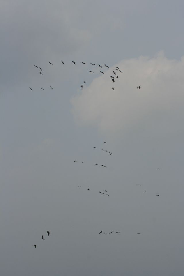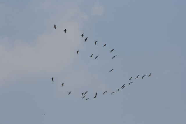 東西干拓橋付近で飛んでいるツルもいっぱい。地上の様子を確認している?