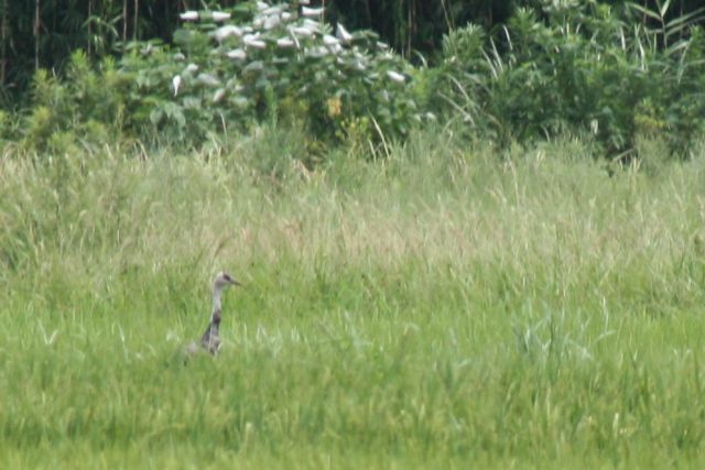 今朝もここ最近いる川に近いところの田んぼに2羽。首をあげたのが見えてやっと確認。座っているのか?地面をつついているのか?見ている場所から離れているためか、なかなか姿が確認できなくてあせる。気配はほとんど感じない。鳴いたりはしてないのかな?
