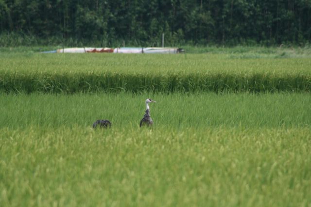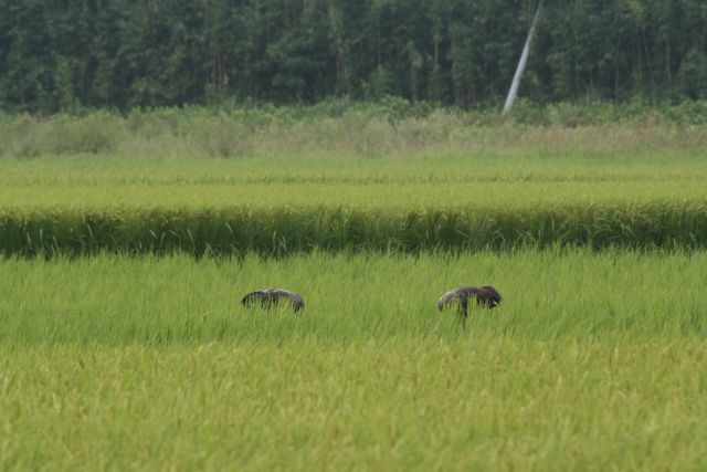 投稿日: 2008年9月5日蒸し暑い日 今朝は9時40分ごろ観察センター付近に到着。むわっとした空気で、薄くもやがかかっているのにすごくまぶしい空。10時 27.0℃ 北東の風1.8m/s 今朝も川沿いに近い田んぼに2羽。ずっと首を下にして食事中。思い出したように首を上げて周りをきょろきょろして警戒。 昼過ぎ、1時40分ごろに見たときにも朝と同じ場所で羽づくろい中。