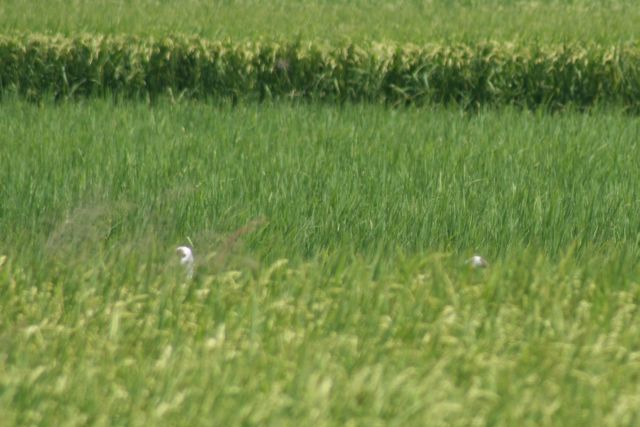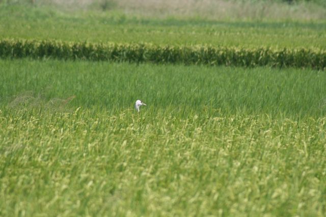 投稿日: 2008年9月8日かくれんぼ 今朝も晴れ!今日は10時前ぐらいに観察センター付近に到着。 10時観察センター前 29.8℃ 北東の風3mツルのねぐら付近 27.7℃ 北北東の風2.4m ツルは最近いる道側2番目の田んぼの手前のほうに2羽。右の1羽はずーっと土を掘り返しているのか?見ている間一度も頭を上げることがなかった。熱心。 お昼頃、見渡す限りの田んぼでどこにツルがいるのか?一時わかりませんでした。じーっと待っていると、ぴょこ・・・・・ぴょこ・・・・と一瞬首をあげた。
