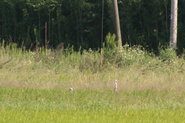 朝のツルはいつもの田んぼの奥。草丈がすごく高くて、隣接する道路からは全然見えない。川岸の道路からやっと見つけるけれど、はっきりと見えるのは首をあげたときだけ。