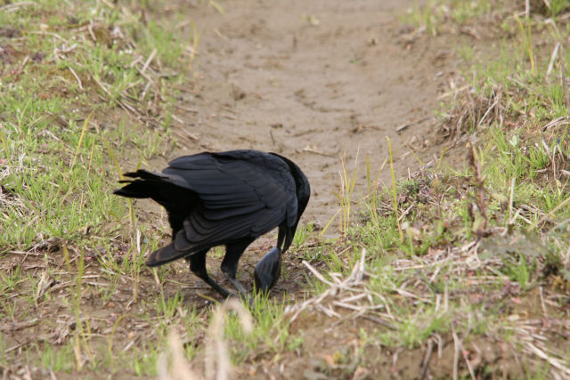 東干拓にて貝を落として割って食べるカラス。
