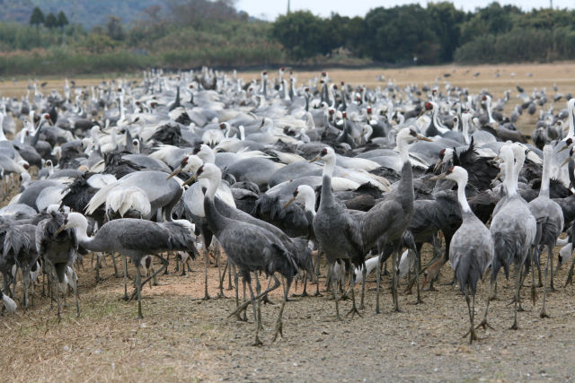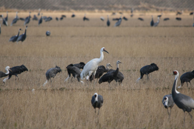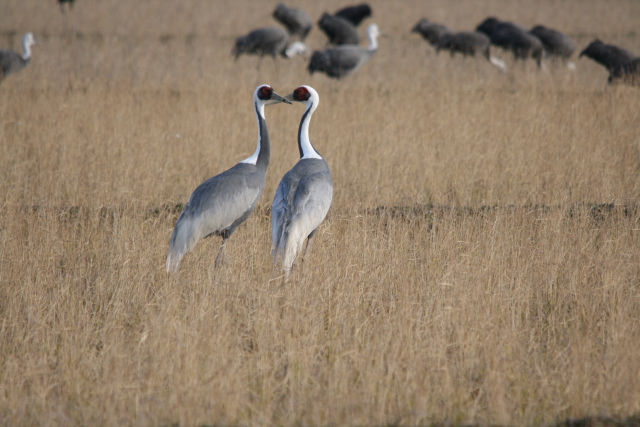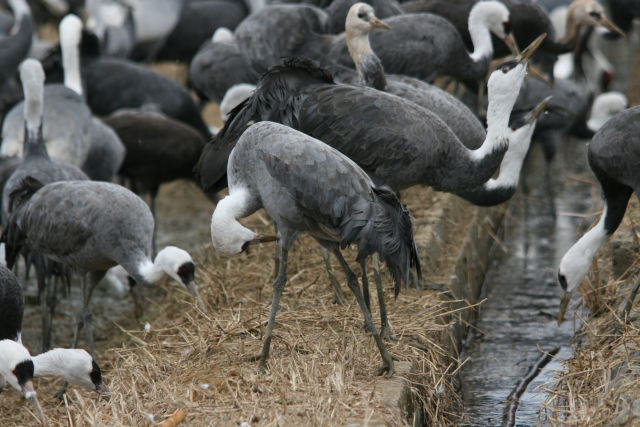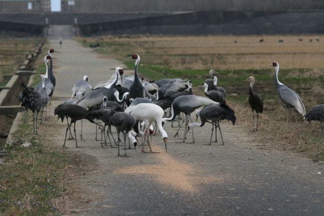 このM78マナヅルが道路上に上がると、ソデグロヅルが恐れをなして?逃げ出します。すごく強いツルみたい。このマナヅルがソデグロを追いかけ回してエサがある場所から追い出していたから、最近はこのマナツルがやってきたら道路の上から逃げ出すし、いなくなれば道路に上がって悠然と餌を食べる。