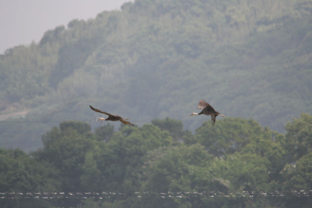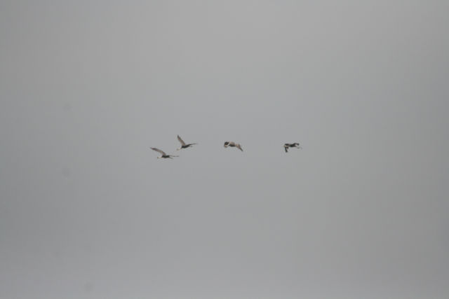 そのまま帰ってくるかなと思ってみていると、完全に見えなくなったので慌てて西干拓方面へ移動。そうしたら堤防の向こうからこちらに向かって飛んでくる4羽の姿が見えた。