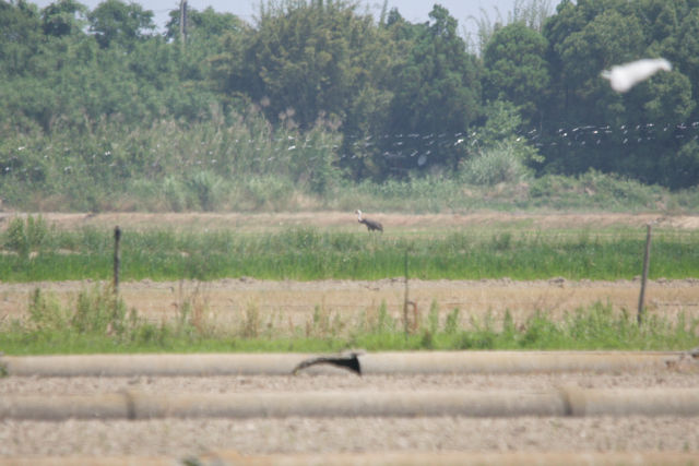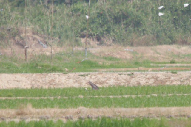 農道の上から飛び出した幼鳥1羽が、突然失速して田んぼの中に落下。