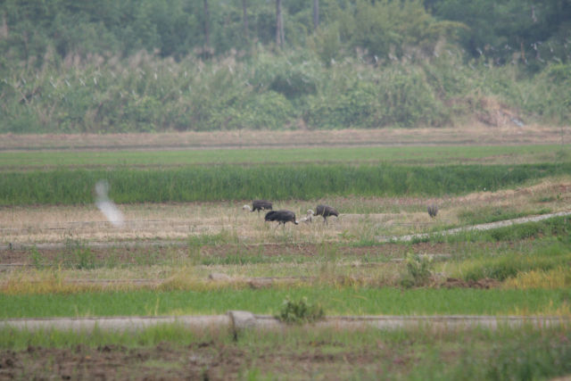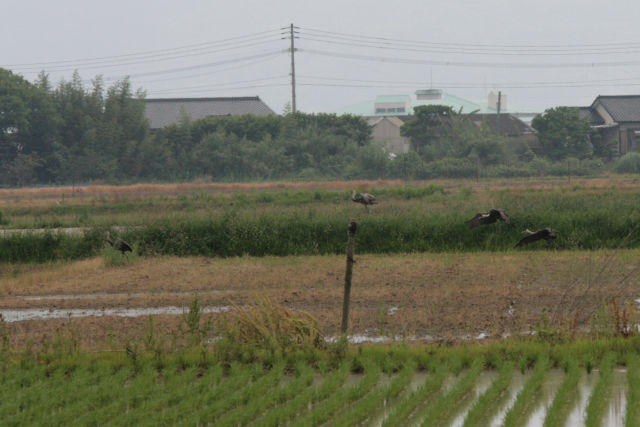 着地したあとは合流。農道を越えた田んぼに移動しています。先に降りた幼鳥が、あとに降りてきた幼鳥の方を気にしてる?