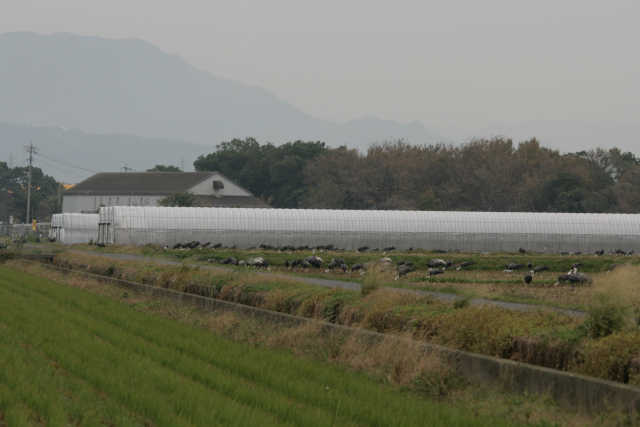 東干拓のビニールハウス付近にひしめくツルたち。風よけとして利用されているみたい。