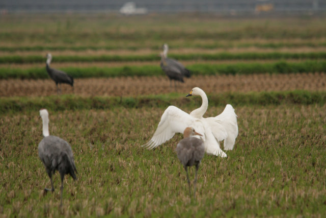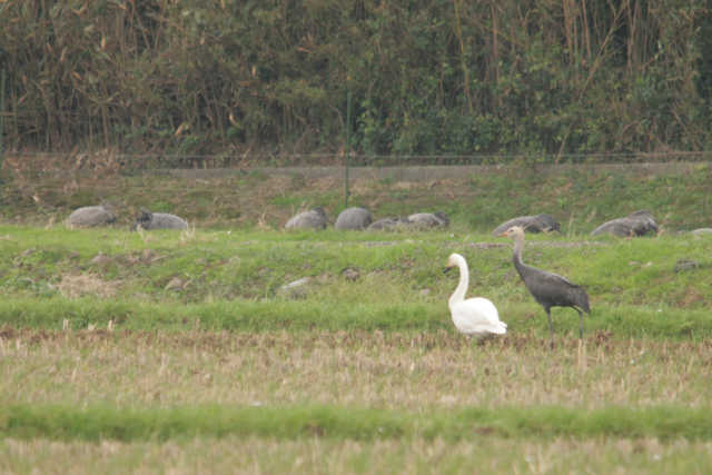 コハクチョウは、東干拓の奥でツルたちと一緒。