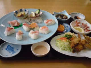 そのまま阿久根漁港内のぶえんかんへ。今日は「タカエビ御膳」1500円を注文。(エビだしの味噌汁付)タカエビがとろっと甘い!甘エビよりももっとあまあいおいしいエビでした。そのほか、エビフライや刺身等々ボリューム満点。40分待ちもなんのその、おいしい昼食でした。