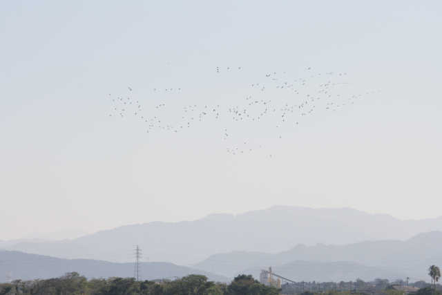 東干拓に着いてしばらくたった頃、南東の方角にツルの群れが飛んでいるのを見る。随分とたくさんのナベヅル。