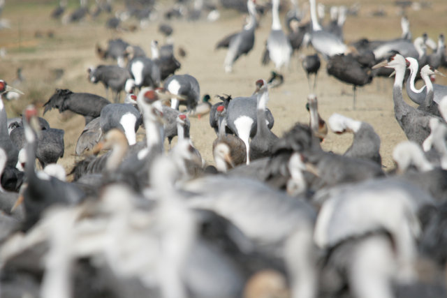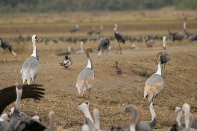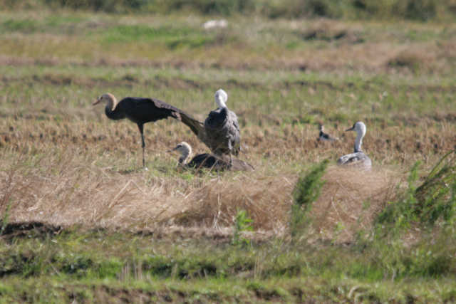マナヅルは、家族連れだったのだけど、親は気にしてる様子もなかった。幼鳥がちょろちょろ歩き回るたびに、ナベヅル親が追いかけてきて威嚇。執拗に威嚇されるものだから、両親の間に逃げ込んだりも。