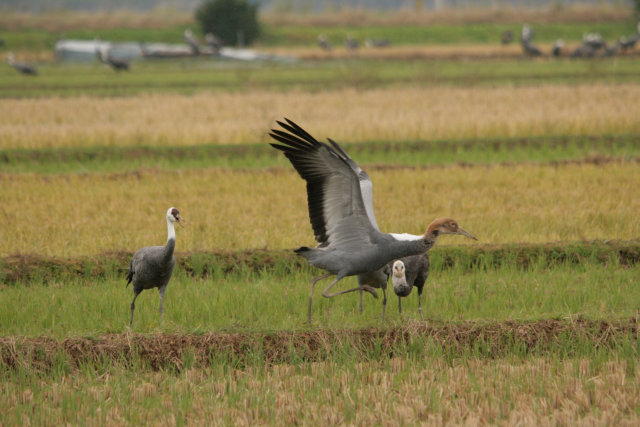 マナヅル幼鳥が、ナベヅルに追いかけられる。