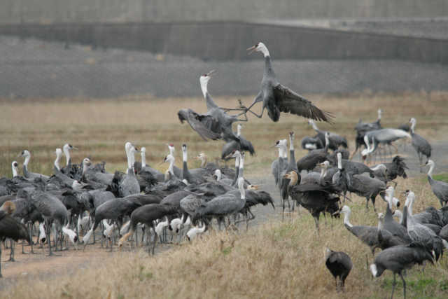 羽数調査も終わり、餌を撒かれて群がるツルたち。
