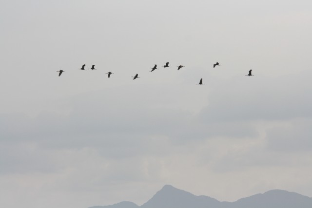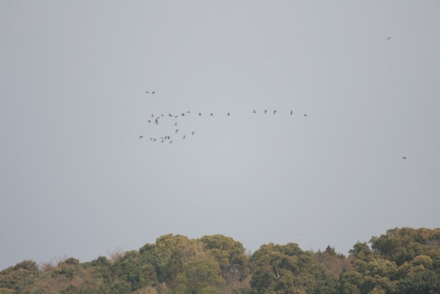 曇っているし長崎あたりの天気も良くなさそうなんだけど、9時40分頃ナベヅル3羽が飛び出したのを皮切りに、15分ほどの間にどんどん飛び出しました。