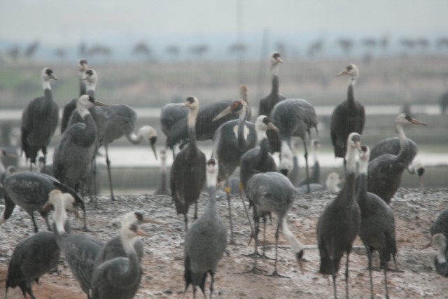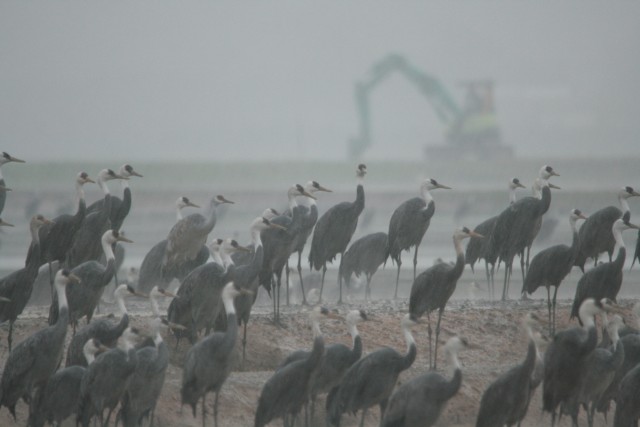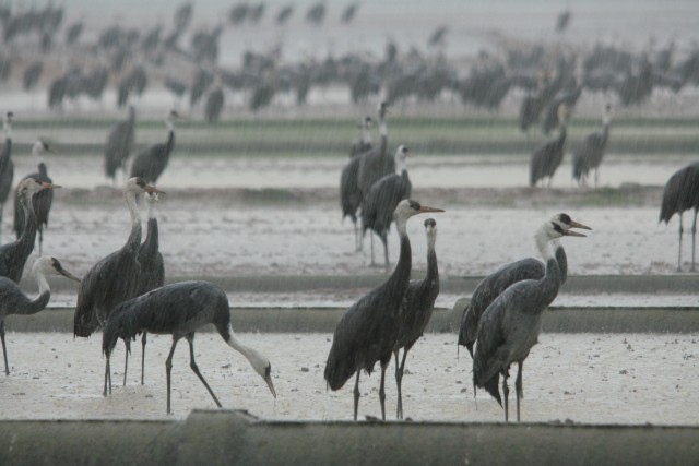 20日、周南市八代のナベヅル8羽が北帰行に向けたリハーサルを始めた。