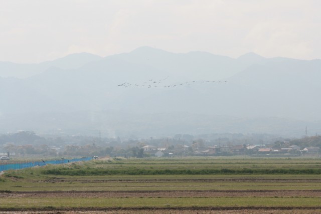 初めの方で飛び出したツルは、羽数調査場所の上空を長い間旋回していたけれど、高い上空でやっと気流をつかめたのか、雨掛山の端~野口港の間をV字になって飛んでいった。