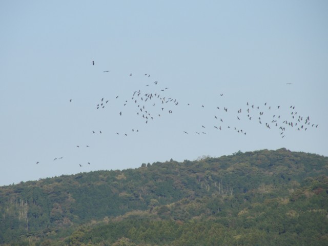 9時48分、8羽のナベヅルが飛び出してくると、後を追って100羽近くが高く飛び出してきた。風に煽られ、江内上空で旋回。
