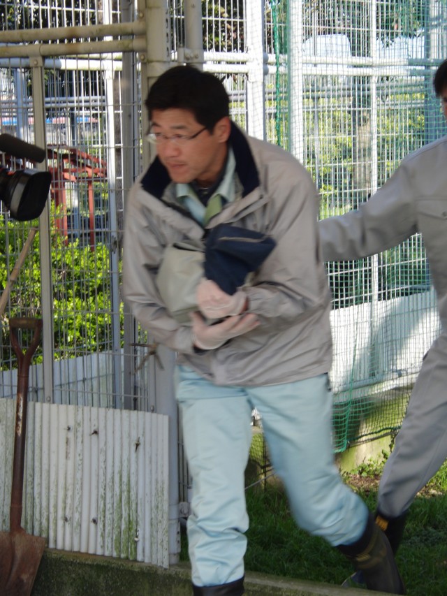 まずは、保護ケージからツルを捕獲。