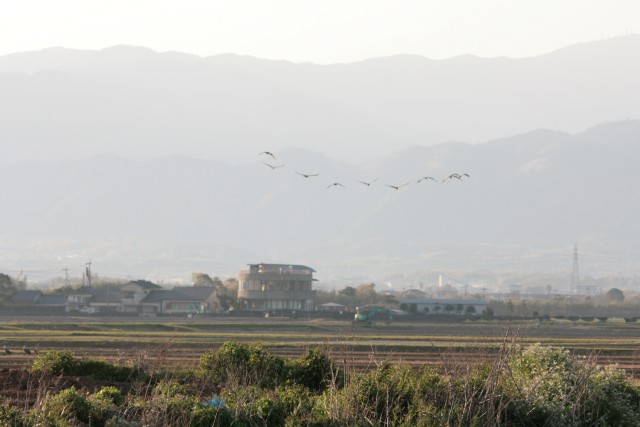 初めの方で飛び出したツルは、羽数調査場所の上空を長い間旋回していたけれど、高い上空でやっと気流をつかめたのか、雨掛山の端~野口港の間をV字になって飛んでいった。