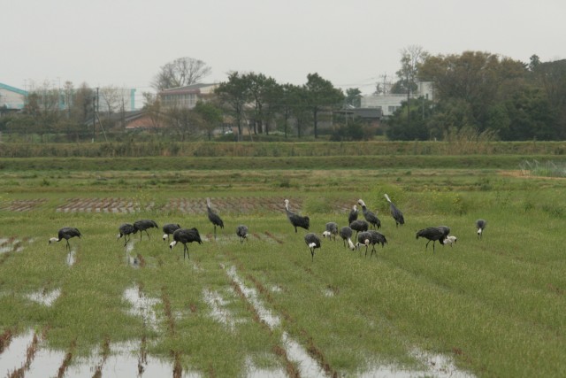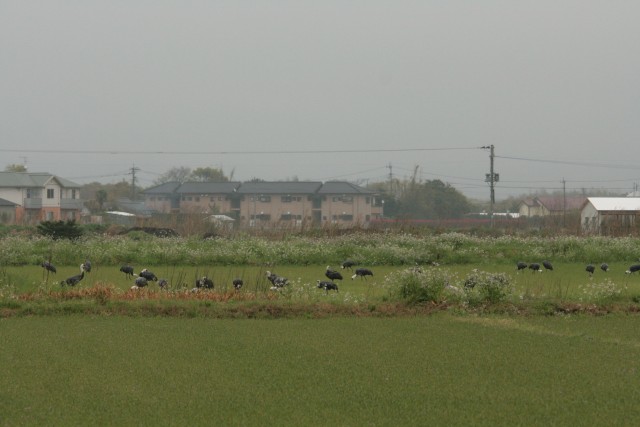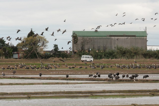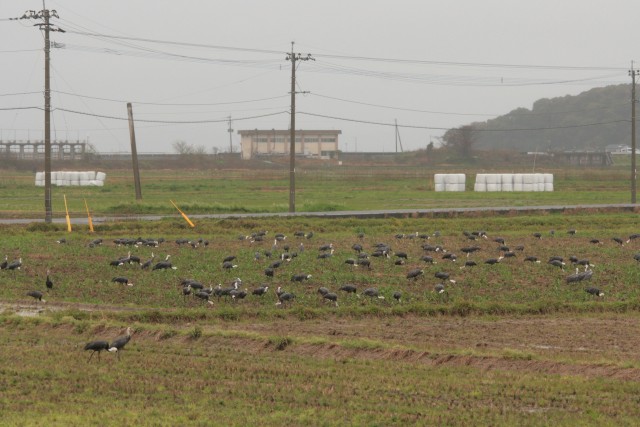 東干拓の下水処理場前に、たくさんのナベヅル達集合。