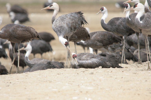 「桜がきれいだね~」とツルと反対方向を向いてダンナと話していると、こちらを気にしながらもちょっとは警戒を緩めながら地面をつついていました。「あのマナヅルは~」なんて話していると、警戒を強めて羽ばたきをし始めました。言葉がわかっているの?